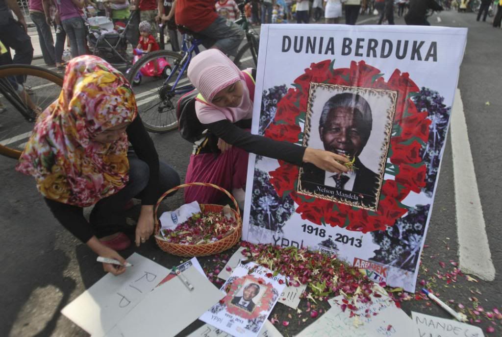 "It puts a ... stamp on the importance that the United States thought of Mandela, his importance as a world leader," Kumar said.http://news.yahoo.com/obama-bush-embark-mandela-memorial...news.yahoo.comBy Steve Holland ABOARD AIR FORCE ONE (Reuters) - President Barack Obama, formerPresident George W. Bush and their wives shared Air Force One on Monday on a flight to South Africa, where they will be joined by two other former presidents at a memorial service for the late Nelson Mandela. The rare g... - Francis Limhttp://i168.photobucket.com/.../Muslimwomensprinkleflower...Muslim women sprinkle flowers on a portrait of the late Nelson Mandela put on street as a tribute to the former South African president in Surabaya, East Java, Indonesia, Sunday, Dec 8, 2013. Mandela died aged 95 Thurs night after a long illness. Writings on the portraits say: THE WORLD MOUNRNS